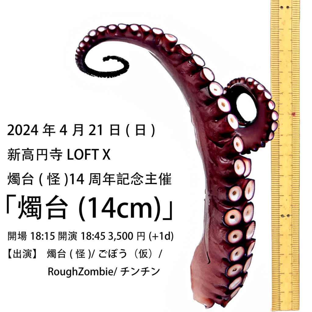 LIVE 2024.03.02 2024年4月21日(日)新高円寺LOFT X 燭台(怪)14周年記念主催「燭台(14cm)」 開場18:15 開演18:45 3,500円(+1d) 4月21日(日)新高円寺LOFT X 燭台(怪)14周年記念主催「燭台(14cm)」 開場18:15 開演18:45 3,500円(+1d) 【出演】 燭台(怪)/ごぼう(仮)/RoughZombie/チンチン